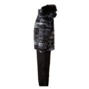Bērnu jakas un bikšu komplekts Ūdens un vēja necaurlaidīgs, gaisu caurlaidīgs virsējais materiāls Jakas un bikšu odere no mīksta auduma Piedurknēs iestrādāta gumijas apdare Noņemamā kapuce pie apkakles piestiprināma ar velkro aizdari Kapucei noņemama mākslīgās kažokādas mala Biksēm ir noņemamas un regulējamas elastīgās lences Vidukļa daļā iestrādāta gumijas apdare Kāju daļas pasargātas no sniega mitruma Starās iestrādāti rāvējslēdzēji ar stoperi Ūdens necaurlaidīgi līmēti izšuvumi Kā jakai, tā arī biksēm ir atstarojošas detaļas