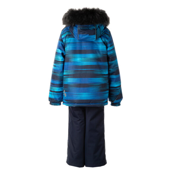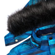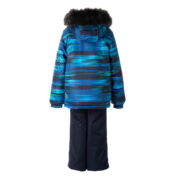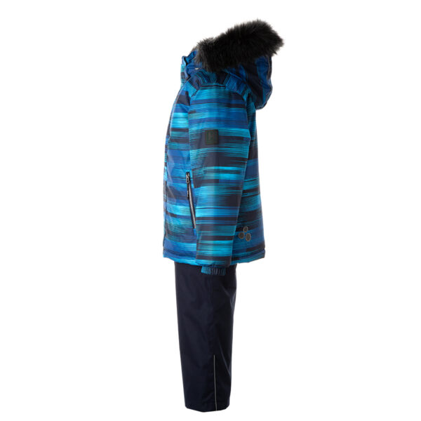 Bērnu jakas un bikšu komplekts Ūdens un vēja necaurlaidīgs, gaisu caurlaidīgs virsējais materiāls Jakas un bikšu odere no mīksta auduma Piedurknēs iestrādāta gumijas apdare Noņemamā kapuce pie apkakles piestiprināma ar velkro aizdari Kapucei noņemama mākslīgās kažokādas mala Biksēm ir noņemamas un regulējamas elastīgās lences Vidukļa daļā iestrādāta gumijas apdare Kāju daļas pasargātas no sniega mitruma Starās iestrādāti rāvējslēdzēji ar stoperi Ūdens necaurlaidīgi līmēti izšuvumi Kā jakai, tā arī biksēm ir atstarojošas detaļas