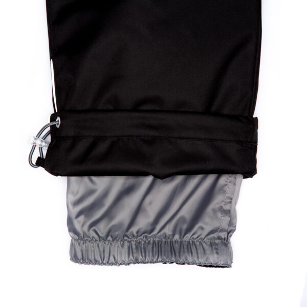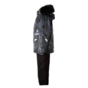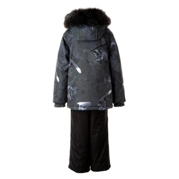 Bērnu jakas un bikšu komplekts Ūdens un vēja necaurlaidīgs, gaisu caurlaidīgs virsējais materiāls Jakas un bikšu odere no mīksta auduma Piedurknēs iestrādāta gumijas apdare Noņemamā kapuce pie apkakles piestiprināma ar velkro aizdari Kapucei noņemama mākslīgās kažokādas mala Biksēm ir noņemamas un regulējamas elastīgās lences Vidukļa daļā iestrādāta gumijas apdare Kāju daļas pasargātas no sniega mitruma Starās iestrādāti rāvējslēdzēji ar stoperi Ūdens necaurlaidīgi līmēti izšuvumi Kā jakai, tā arī biksēm ir atstarojošas detaļas
