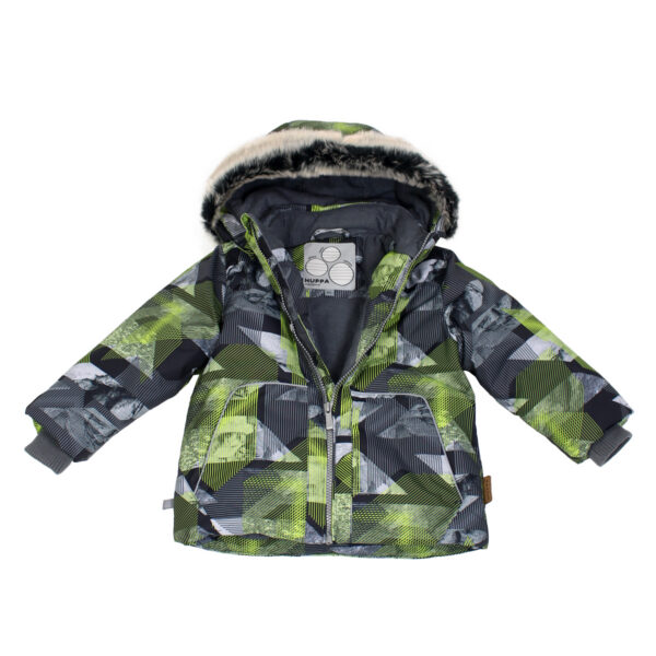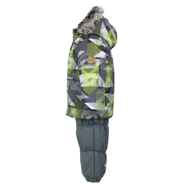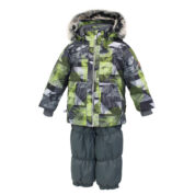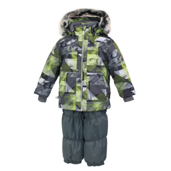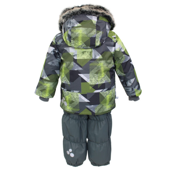 Boys´ winter set. The lining of the set is cotton flannel and the outer fabric is wind and waterproof. The jacket has 300g of insulation and the pants have 160g. Taped seams, elasticated bottoms on the pants and ribbed inner cuffs on the jacket sleeves keep the child warm and dry. The set has reflective details. The removable hood is attached to the collar with snaps.
