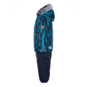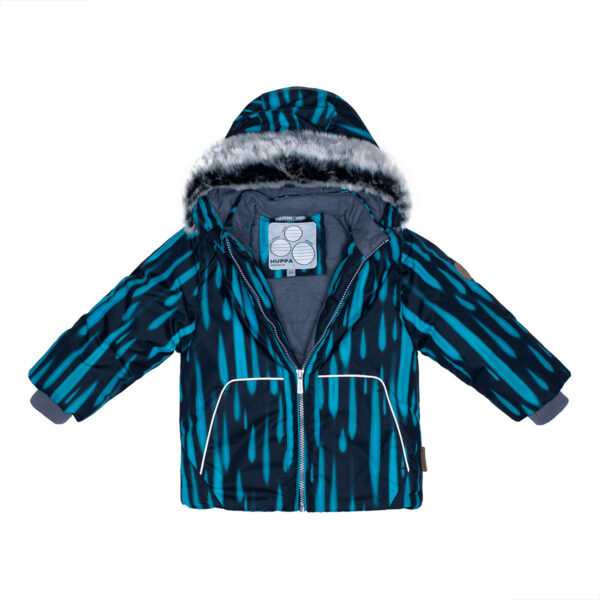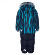 Boys´ winter set. The lining of the set is cotton flannel and the outer fabric is wind and waterproof. The jacket has 300g of insulation and the pants have 160g. Taped seams, elasticated bottoms on the pants and ribbed inner cuffs on the jacket sleeves keep the child warm and dry. The set has reflective details. The removable hood is attached to the collar with snaps.