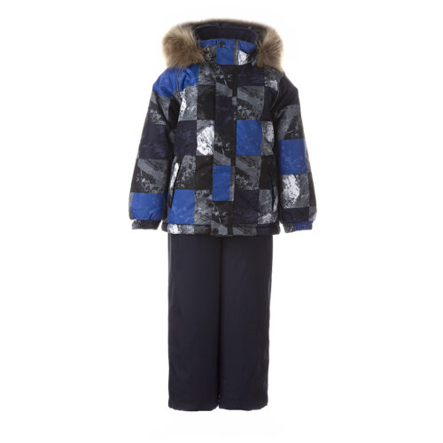 Bērnu jakas un bikšu komplekts. Ūdens un vēja necaurlaidīgs, gaisu caurlaidīgs virsējais audums. Jakai un biksēm ir mīksta odere. Piedurkņu un muguras daļā iestrādāta gumijas apdare. Noņemamā kapuce pie apkakles stiprināma ar velkro aizdari. Kapucei mākslīgās kažokādas malai. Biksēm ir augstais viduklis un regulējamas elastīgās lences. Jostas daļā iestrādāts gumijas paliktnis. Staras aizdarāmas ar stoperi. Ūdens necaurlaidīgi līmēti izšuvumi. Biksēm trūkst iekšējais staru apšuvums. Kā jakai, tā arī biksēm ir atstarojošas detaļas.