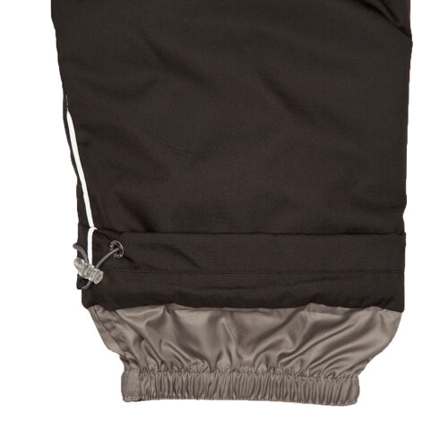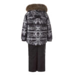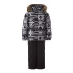 Bērnu jakas un bikšu komplekts. Ūdens un vēja necaurlaidīgs, gaisu caurlaidīgs virsējais audums. Jakai un biksēm ir mīksta odere. Piedurkņu un muguras daļā iestrādāta gumijas apdare. Noņemamā kapuce pie apkakles stiprināma ar velkro aizdari. Kapucei mākslīgās kažokādas malai. Biksēm ir augstais viduklis un regulējamas elastīgās lences. Jostas daļā iestrādāts gumijas paliktnis. Staras aizdarāmas ar stoperi. Ūdens necaurlaidīgi līmēti izšuvumi. Biksēm trūkst iekšējais staru apšuvums. Kā jakai, tā arī biksēm ir atstarojošas detaļas.