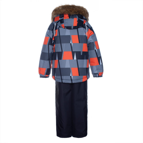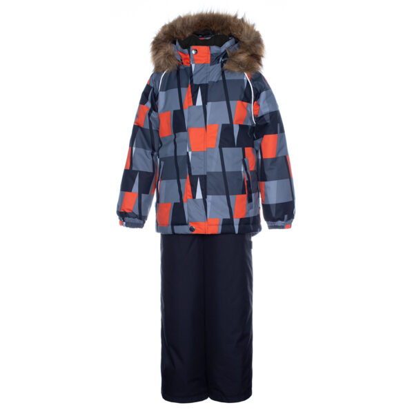 Bērnu jakas un bikšu komplekts. Ūdens un vēja necaurlaidīgs, gaisu caurlaidīgs virsējais audums. Jakai un biksēm ir mīksta odere. Piedurkņu un muguras daļā iestrādāta gumijas apdare. Noņemamā kapuce pie apkakles stiprināma ar velkro aizdari. Kapucei mākslīgās kažokādas malai. Biksēm ir augstais viduklis un regulējamas elastīgās lences. Jostas daļā iestrādāts gumijas paliktnis. Staras aizdarāmas ar stoperi. Ūdens necaurlaidīgi līmēti izšuvumi. Biksēm trūkst iekšējais staru apšuvums. Kā jakai, tā arī biksēm ir atstarojošas detaļas.