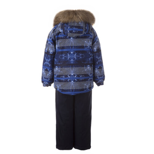 Bērnu jakas un bikšu komplekts. Ūdens un vēja necaurlaidīgs, gaisu caurlaidīgs virsējais audums. Jakai un biksēm ir mīksta odere. Piedurkņu un muguras daļā iestrādāta gumijas apdare. Noņemamā kapuce pie apkakles stiprināma ar velkro aizdari. Kapucei mākslīgās kažokādas malai. Biksēm ir augstais viduklis un regulējamas elastīgās lences. Jostas daļā iestrādāts gumijas paliktnis. Staras aizdarāmas ar stoperi. Ūdens necaurlaidīgi līmēti izšuvumi. Biksēm trūkst iekšējais staru apšuvums. Kā jakai, tā arī biksēm ir atstarojošas detaļas.