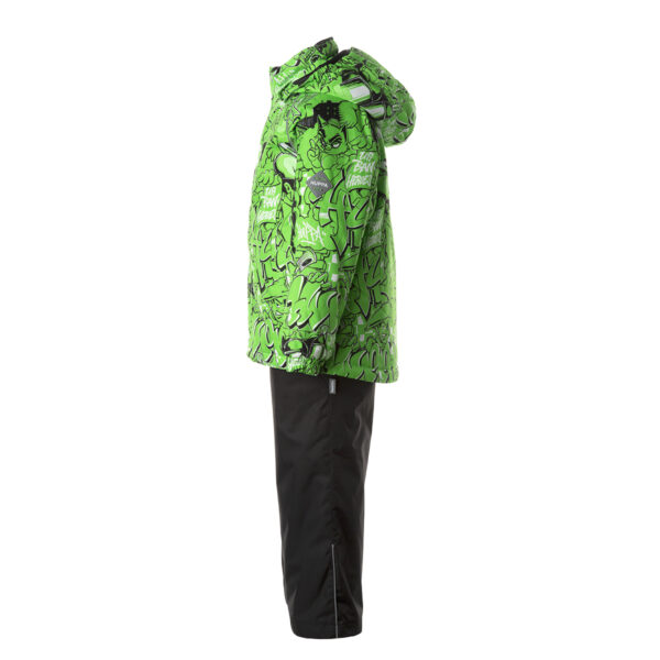 Bērnu jakas un bikšu komplekts. Ūdens un vēja necaurlaidīgs, gaisu caurlaidīgs virsējais audums. Jakai un biksēm ir mīksta odere. Piedurkņu, un kapuces malā iestrādāta gumijas apdare. Noņemamā kapuce pie apkakles stiprināma ar velkro aizdari. Kapucei mākslīgās kažokādas malai. Biksēm ir augstais viduklis un regulējamas elastīgās lences. Jostas daļā iestrādāts gumijas paliktnis. Staras aizdarāmas ar stoperi. Ūdens necaurlaidīgi līmēti izšuvumi. Biksēm trūkst iekšējais staru apšuvums. Kā jakai, tā arī biksēm ir atstarojošas detaļas.