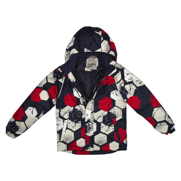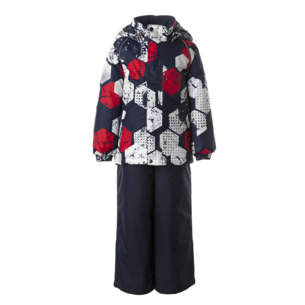 Bērnu jakas un bikšu komplekts. Ūdens un vēja necaurlaidīgs, gaisu caurlaidīgs virsējais audums. Jakai un biksēm ir mīksta odere. Piedurkņu, un kapuces malā iestrādāta gumijas apdare. Noņemamā kapuce pie apkakles stiprināma ar velkro aizdari. Kapucei mākslīgās kažokādas malai. Biksēm ir augstais viduklis un regulējamas elastīgās lences. Jostas daļā iestrādāts gumijas paliktnis. Staras aizdarāmas ar stoperi. Ūdens necaurlaidīgi līmēti izšuvumi. Biksēm trūkst iekšējais staru apšuvums. Kā jakai, tā arī biksēm ir atstarojošas detaļas.