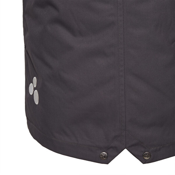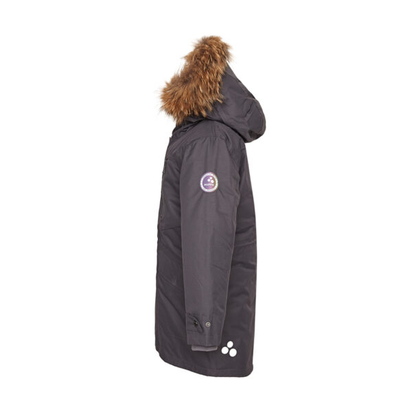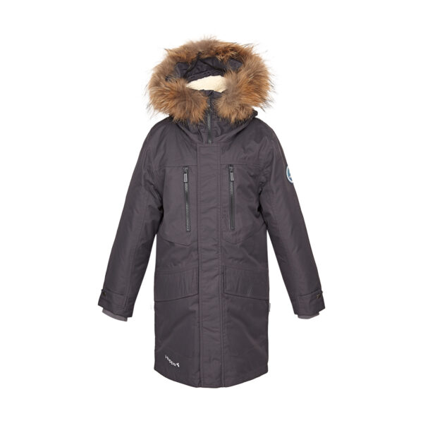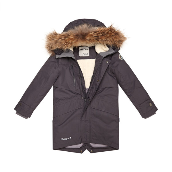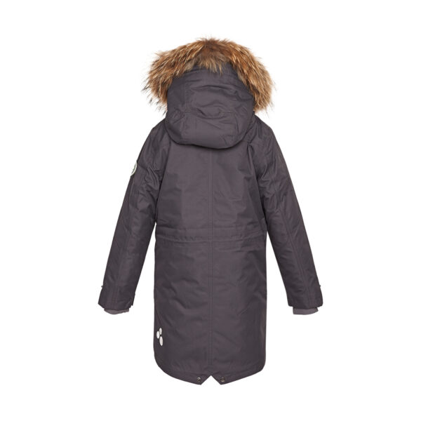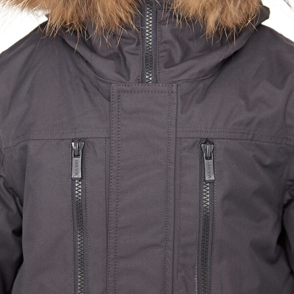 Bērnu ūdens un vēja necaurlaidīgā ziemas jaka. Gaisu caurlaidīgs virsējais audums. Jakas odere no mīksta auduma. Muguras augšdaļā un kapuces iekšējos sānos jērādas imitācijas odere. Regulējama kapuce. Rievota piedurkņu apdare. Regulējamas piedurknes. Priekšpusē apšūts dubultā virziena rāvējslēdzējs. Vidukļa daļā rāvējslēdzējs ar stoperi. Ūdens necaurlaidīgi līmēti izšuvumi. Atsevišķi noņemama dabīga kažokādas apmale. Auduma virspusē atstarojošas detaļas.