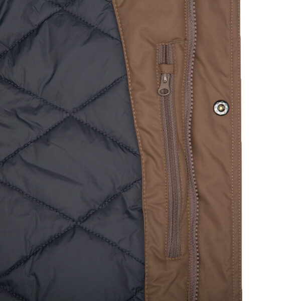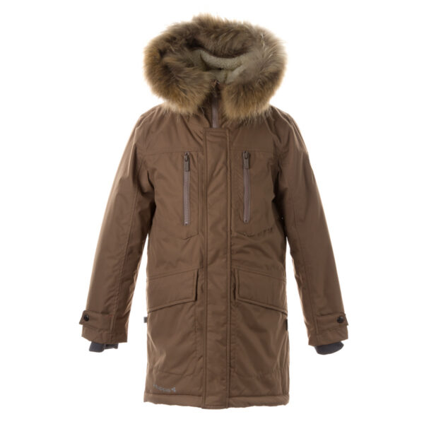 Bērnu ūdens un vēja necaurlaidīgā ziemas jaka. Gaisu caurlaidīgs virsējais audums. Jakas odere no mīksta auduma. Muguras augšdaļā un kapuces iekšējos sānos jērādas imitācijas odere. Regulējama kapuce. Rievota piedurkņu apdare. Regulējamas piedurknes. Priekšpusē apšūts dubultā virziena rāvējslēdzējs. Vidukļa daļā rāvējslēdzējs ar stoperi. Ūdens necaurlaidīgi līmēti izšuvumi. Atsevišķi noņemama dabīga kažokādas apmale. Auduma virspusē atstarojošas detaļas.
