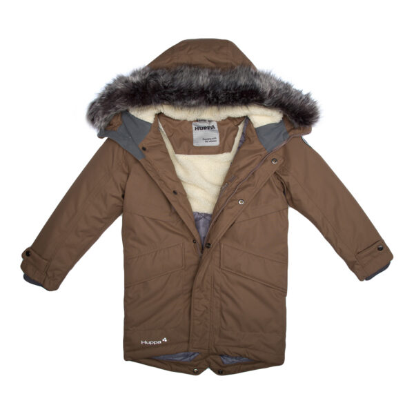 Bērnu ūdens un vēja necaurlaidīgā ziemas jaka. Gaisu caurlaidīgs virsējais audums. Jakas odere no mīksta auduma. Muguras augšdaļā un kapuces iekšējos sānos jērādas imitācijas odere. Regulējama kapuce. Rievota piedurkņu apdare. Regulējamas piedurknes. Priekšpusē apšūts dubultā virziena rāvējslēdzējs. Vidukļa daļā rāvējslēdzējs ar stoperi. Ūdens necaurlaidīgi līmēti izšuvumi. Kapucei noņemama mākslīgās kažokādas mala. Auduma virspusē atstarojošas detaļas.
