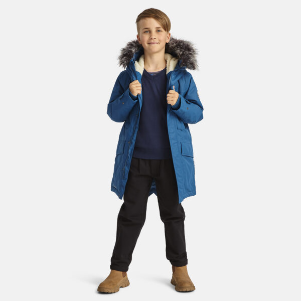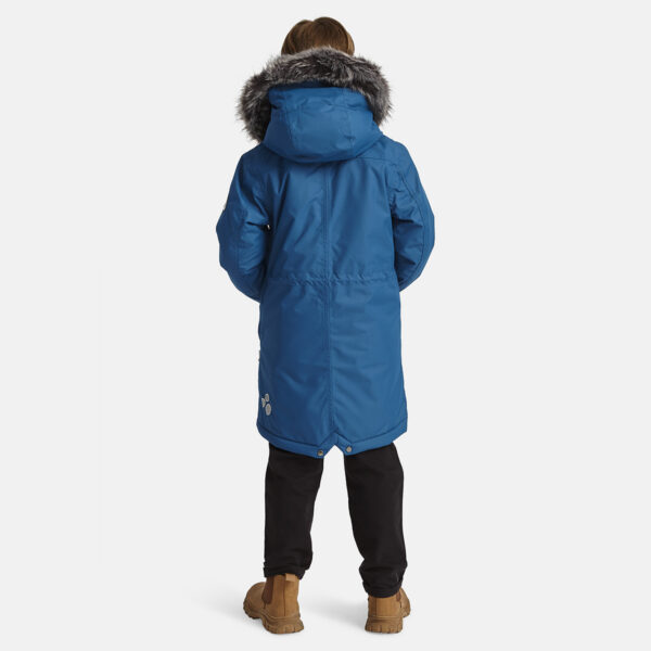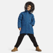Bērnu ūdens un vēja necaurlaidīgā ziemas jaka. Gaisu caurlaidīgs virsējais audums. Jakas odere no mīksta auduma. Muguras augšdaļā un kapuces iekšējos sānos jērādas imitācijas odere. Regulējama kapuce. Rievota piedurkņu apdare. Regulējamas piedurknes. Priekšpusē apšūts dubultā virziena rāvējslēdzējs. Vidukļa daļā rāvējslēdzējs ar stoperi. Ūdens necaurlaidīgi līmēti izšuvumi. Kapucei noņemama mākslīgās kažokādas mala. Auduma virspusē atstarojošas detaļas.