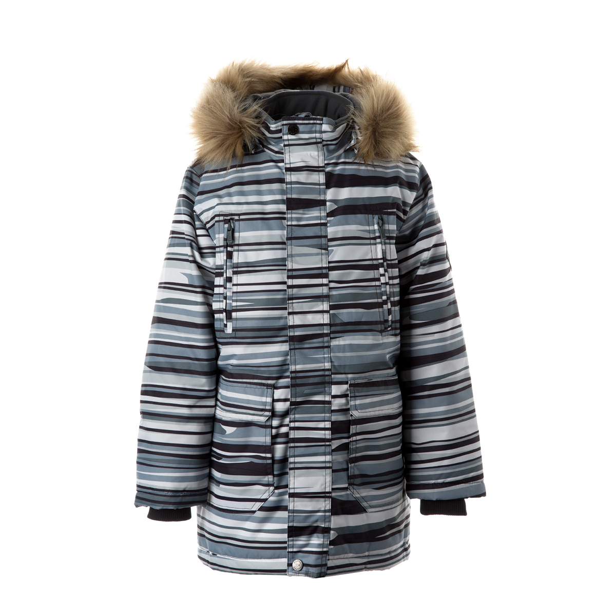 Bērnu ūdens un vēja necaurlaidīga ziemas jaka. Gaisu caurlaidīgs virsējais audums. Mīksta jakas odere. Noņemamā kapuce pie apkakles stiprināma ar velkro aizdari. Rievotas piedurknes. Kapucei noņemama mākslīgās kažokādas mala. Ūdens necaurlaidīgi līmēti izšuvumi. Auduma virspusē atstarojošas detaļas.