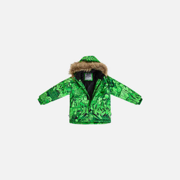 Bērnu ūdens un vēja necaurlaidīga jaka. Gaisu caurlaidīgs virsējais audums. Mīksta jakas odere. Noņemamā kapuce pie apkakles stiprināma ar velkro aizdari. Piedurknēs un kapucē iestrādāta gumijas apdare. Priekšpusē apšūta rāvējslēdzēja aizdare. Priekšpusē kabatas. Kapucei mākslīgās kažokādas mala. Auduma virspusē atstarojošas detaļas.