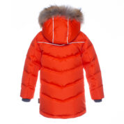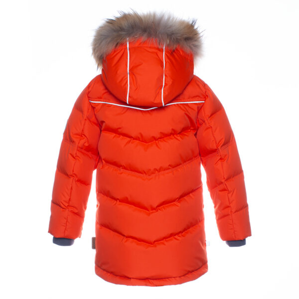 Children’s waterproof and windproof down jacket. Breathable fabric. Soft mesh lining on the inside. Down feathers and feathers for filling. Removable snap-on hood. Ribbed cuffs at sleeve ends. With zipper. Integrated zipper pockets at front. Removable natural fur trim on hood. Reflective elements on fabric.