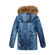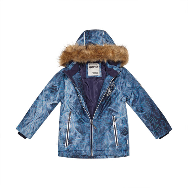 Boys´ winter jacket. Wind- and waterproof outer fabric and its insulation is 300g. For best visibility in the dark, the jacket has been equipped with reflective details. The ribbed inner cuffs on the sleeves keep the child warm and dry. The removable hood is safe – it is fastened with snaps to prevent it from getting caught, and its fur trim is also removable. The front pockets of the jacket are equipped with zippers.