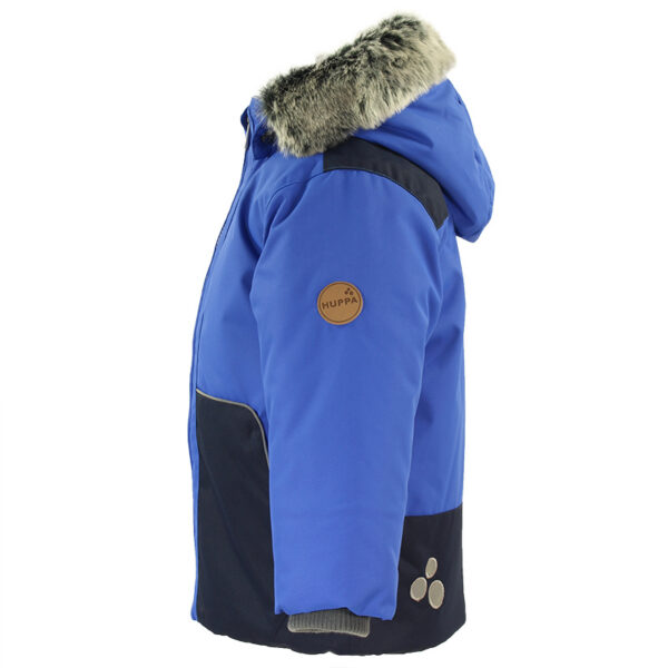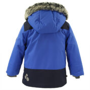 Toddler winter jacket with 300g insulation. The lining of the jacket is soft cotton flannel and the outer fabric is wind and water resistant. Taped seams and ribbed inner cuffs on the sleeves keep the child warm and dry. To ensure that the child is visible even in the dark, the jacket has been equipped with reflective details and the front is decorated with a reflective detail. The removable hood is safe for playing outside – it is fastened with snaps to prevent getting caught and its fur edge is also removable