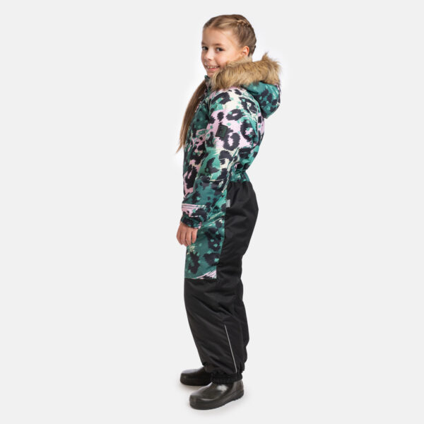 Children’s water- and windproof snowsuit with 200 g insulation. Breathable outer fabric. Soft fabric on the inside of the snowsuit. Elastic cuffs of sleeve and leg ends, plus hood with elastic edging. Detachable hood fastens to the collar with snap buttons. Elastic waistband with buttonholes. Waterproof taped seams. The product comes with elastic stirrups. Reflective detailing on outer fabric.