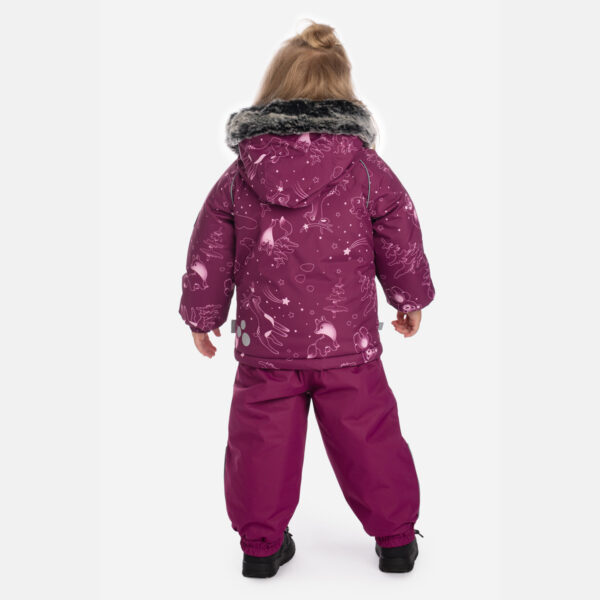 Laste talvekomplekt. Jope ja püksid on valmistatud vee- ja tuulekindlast ning hingavast pealiskangast, mis hoiab lapsed kuivana ja mugavalt. Pehme võrkvooder lisab kandmismugavust. Jopel on varrukate otstes integreeritud kummipael, eemaldatav trukkidega kapuuts kunstkarusnahast äärega ning helkurdetailid paremaks nähtavuseks. Pükstel on elastsed reguleeritavad traksid, integreeritud kummivöökoht ja täielikult teibitud veekindlad õmblused. Koos tagavad need soojuse, mugavuse ja kaitse igaks talviseks seikluseks.