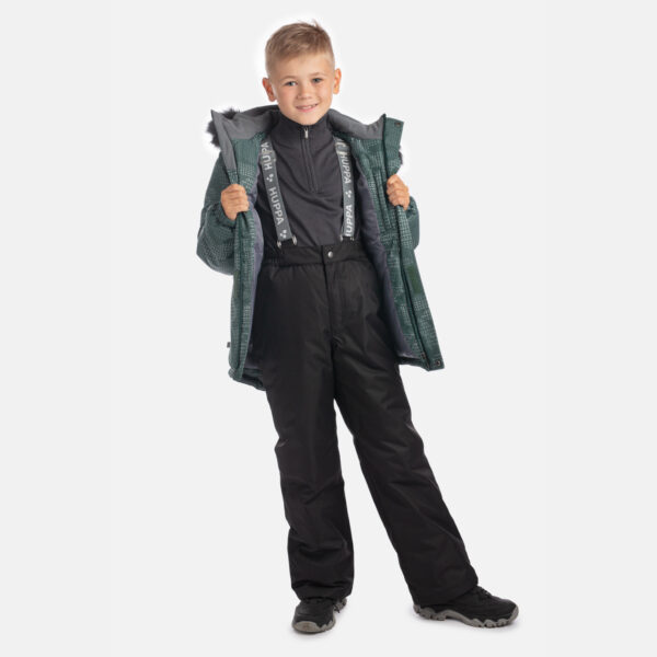 Laste jope ja pükste talvekomplekt. Vee- ja tuulekindel, hingav pealiskangas. Jope ja pükste sisepool on pehmest voodrikangast. Jope on 300 g soojustusega ja püksid 160 g soojustusega. Varrukaotstes sissetöödeldud kummipael. Eemaldatav kapuuts kinnitub kraele trukkidega. Kapuutsil eemaldatav kunstkarusnahast ääris. Pükstel on eemaldatavad reguleeritavad elastsed traksid. Vööjoonel sissetöödeldud kummipael. Sääreotstes lumelukud. Sääreotstes stopperitega kumminööritunnel. Vettpidavad teibitud õmblused. Nii jopel kui ka pükstel on helkurdetailid.